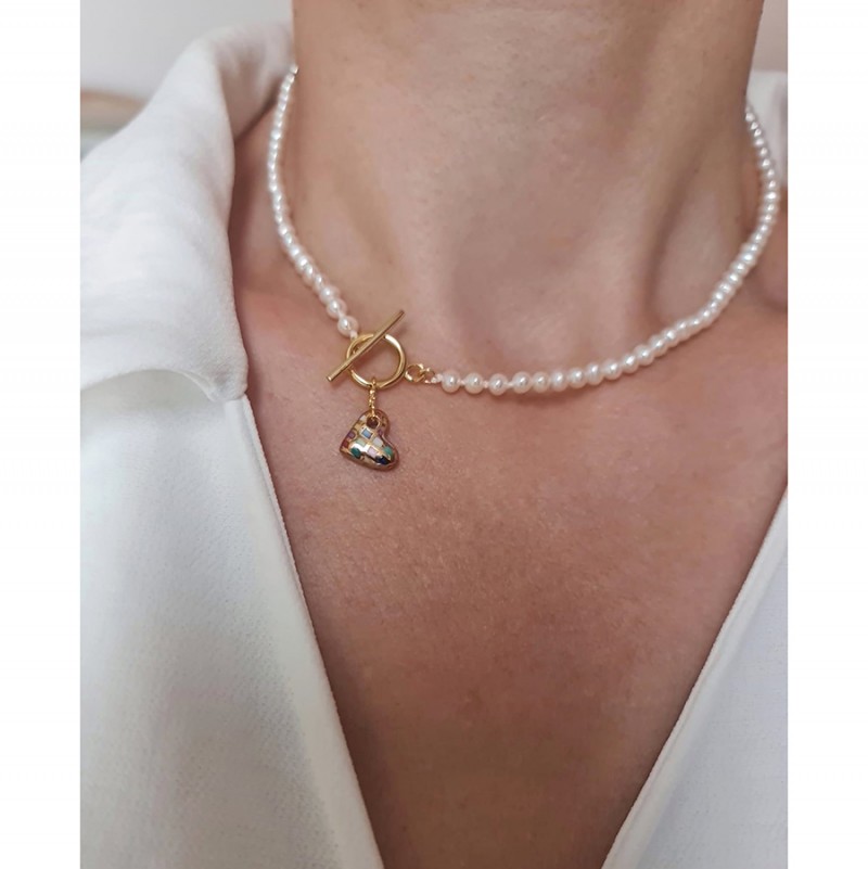 Colier cu perle de cultura si pandantiv portelan inimioara