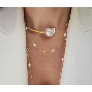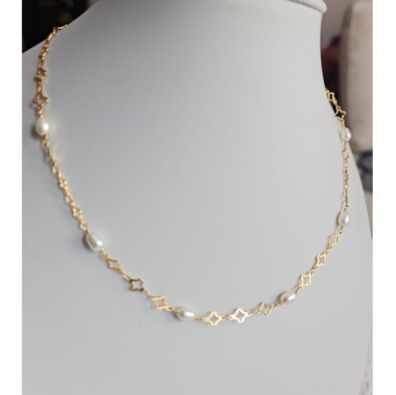 Colier clasic, la baza gatului, realizat cu perle de cultura de apa dulce bob de orez de 5-6 mm, calitate premium si lant decorativ.