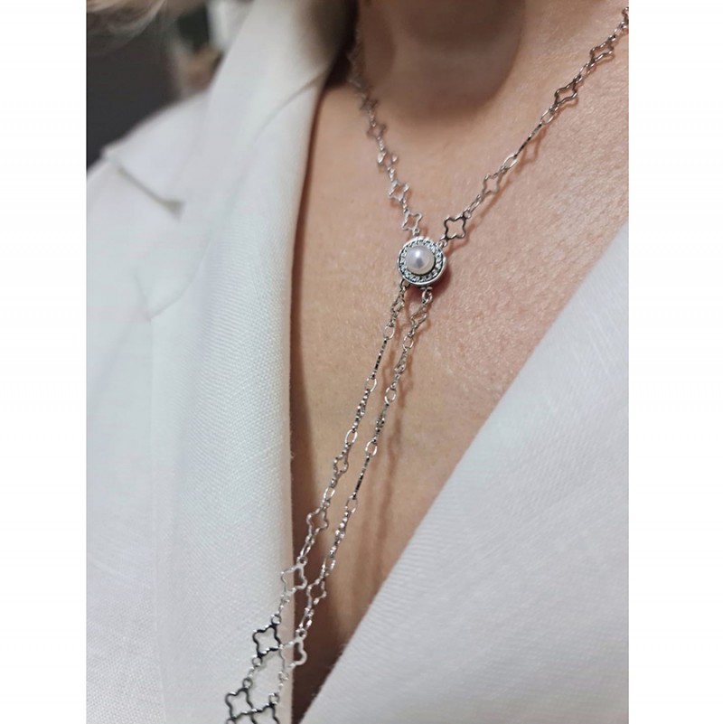 Lanțul decorativ, cu o textură arhitecturală, formează o siluetă eleganta alungită, accentuată de piesa centrală – o perla de cultura buton de 4-5 mm cu luciu minunat, montata intr-un cilindru stilizat.