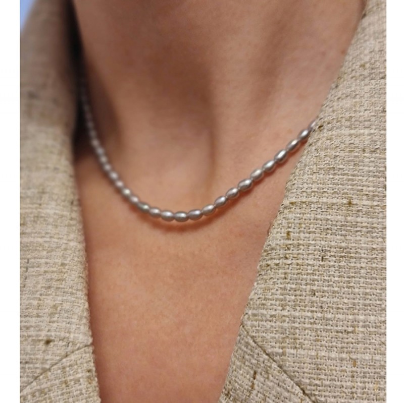 Colier casual, util si versatil realizat cu perle de cultura de apa dulce premium de 4 mm bob de orez, culoare tratata-gri. 38 cm plus prelungire cu lant, 3 cm. Accesorii din argint 925