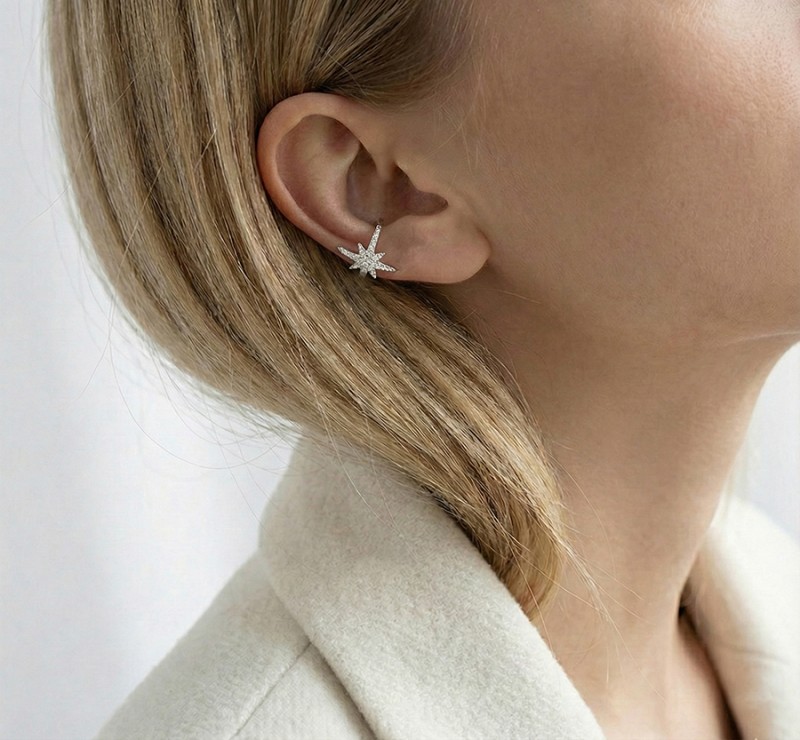 Cercel cuff cu decoratiune Steaua Nordului realizat din argint 925 placat cu aur galben sau rodiu. Cercelul este decorat cu cristale de zirconiu.