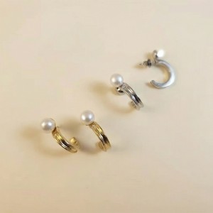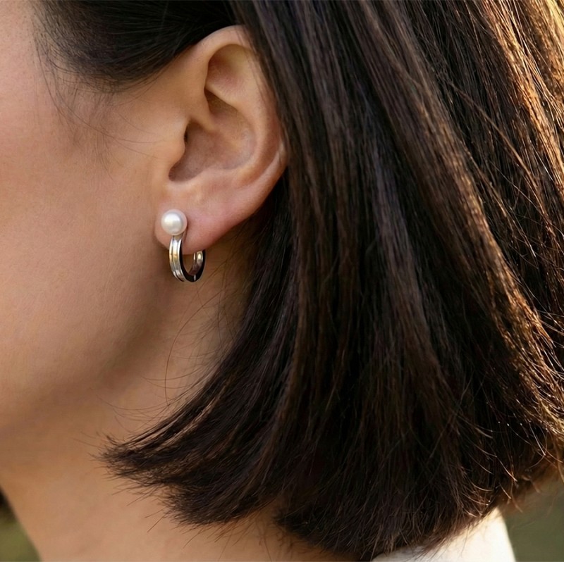 Cercei cu perla button round de 6 mm, culoare naturala-alb, luciu foarte bun, montata pe lob si decoratriune semicerc din argint 925 placat cu rodiu. In functie de disponibilitatea materialelor, ii putem realiza si din argint 925 placat cu aur galben. 1.8 cm