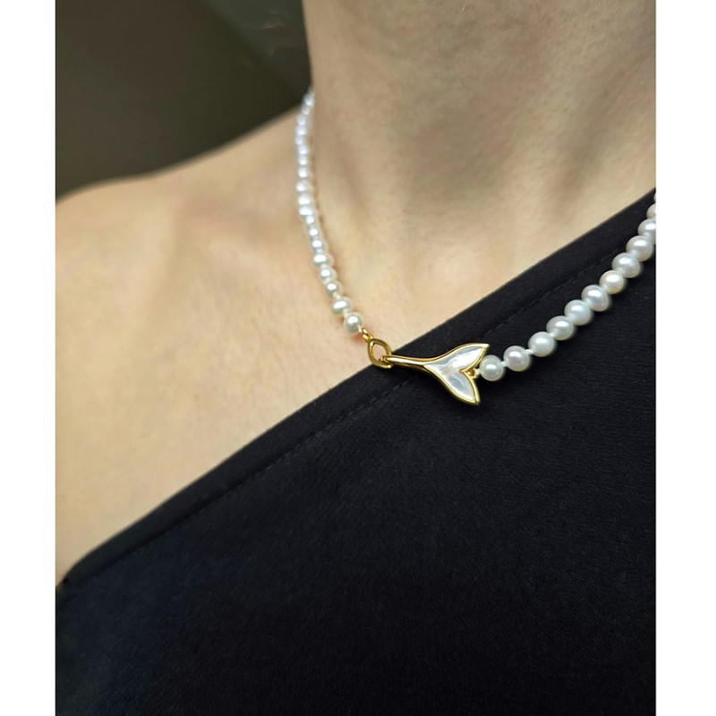 Colier clasic, la baza gatului realizat cu perle de cultura de apa dulce semisferice cu luciu foarte bun, culoare naturala-alb si inchizatoare decorativa din argint 925 placat cu aur galben si decorata cu sidef.