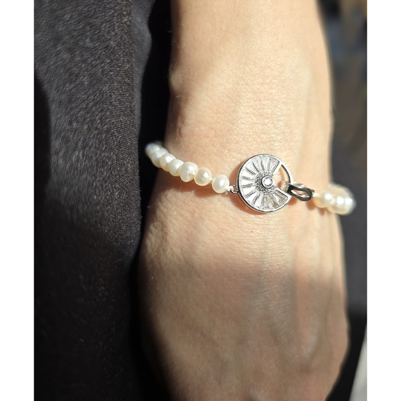 Bratara clasica cu perle de cultura de apa dulce de 5 mm semisferice, luciu bun, culoare naturala-alb unt si inchizatoare decorativa cerc din argint 925 placat cu rodiu.