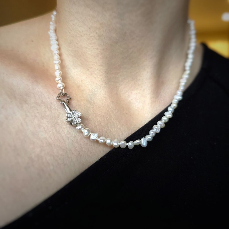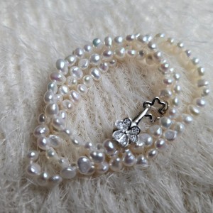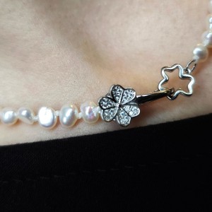 Colier clasic cu inchizatore decorativa model trifoi din argint 925 placata cu rodiu. Colierul este lucrat cu perle de cultura de apa dulce baroc de 4 mm, luciu bun, culoare naturala-alb.
