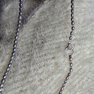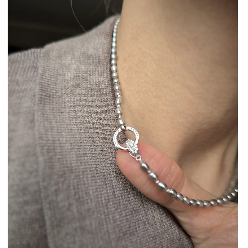 O propunere delicata pentru iubitoarele de gri/argintiu: un colier fin, realizat cu perle de cultura de apa dulce bob de orez de 3.5 mm gri, nuanta tratata. Perlele au luciu bun, fara inele de crestere sau zone semnificative de luciu discontinuu. Inchizatoarea este decorativa, din argint 925 placat cu rodiu.
