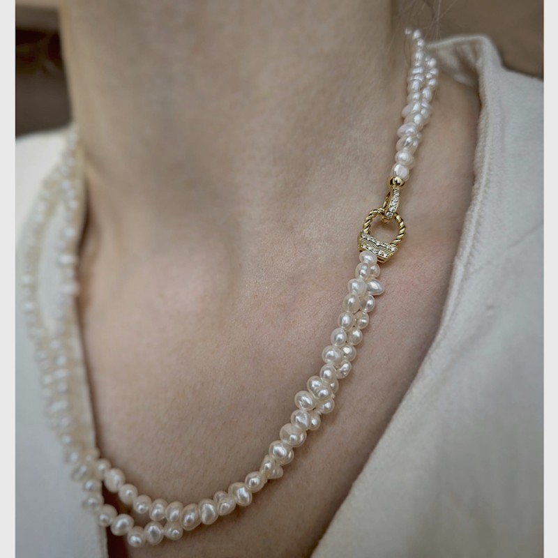 Colier dublu cu perle baroc de 4 mm si inchizatoare decorativa aurie