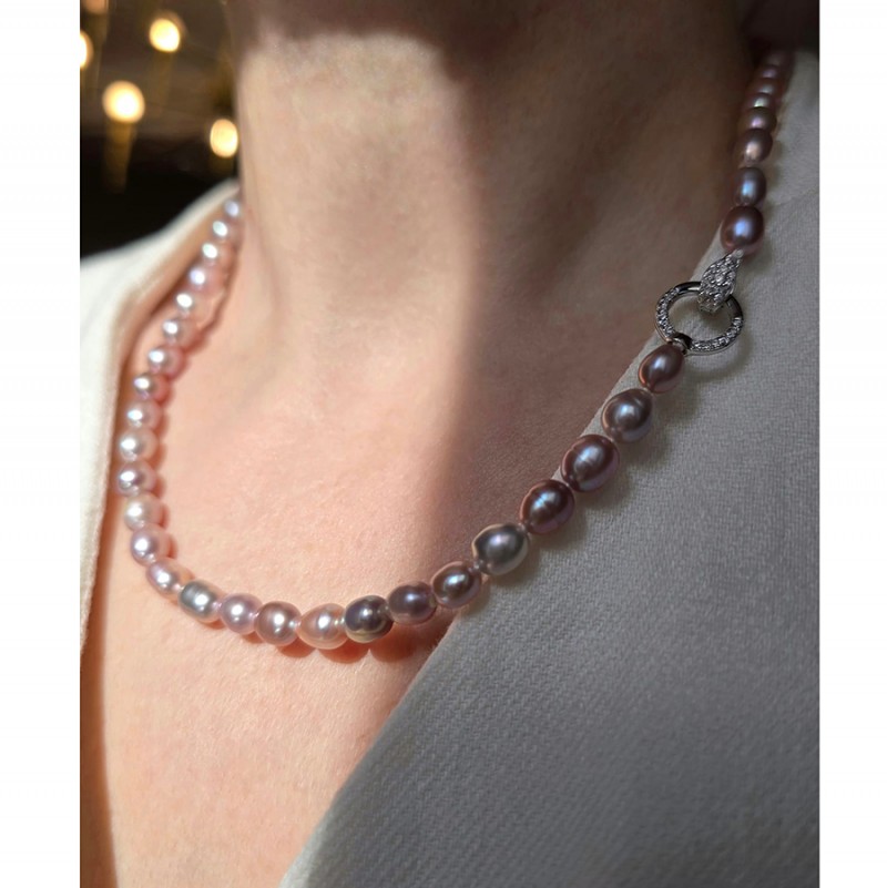 Un colier clasic, suav, usor de integrat in tinuta ta zilnica. Este lucrat cu perle de cultura de apa fulce bob de orez de 6 mm, vuloare naturala-lavanda, luciu mediu si bun si inchizatoare decorativa din argint 925 placat cu rodiu. 42 cm